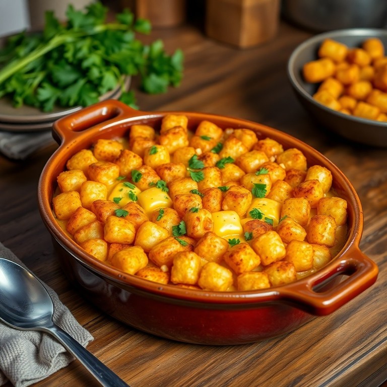 A comforting baked dish combining crispy tater tots, diced ham, and melted cheddar, perfect for a hearty meal. This casserole layers savory ham and sharp cheddar cheese beneath a golden, crispy tater tot topping, creating a satisfying blend of textures and flavors ideal for family dinners or potlucks.