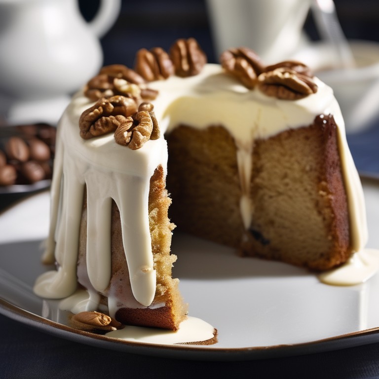 A delightful coffee-infused cake with a hint of walnut flavor, topped with a rich and creamy mascarpone icing.