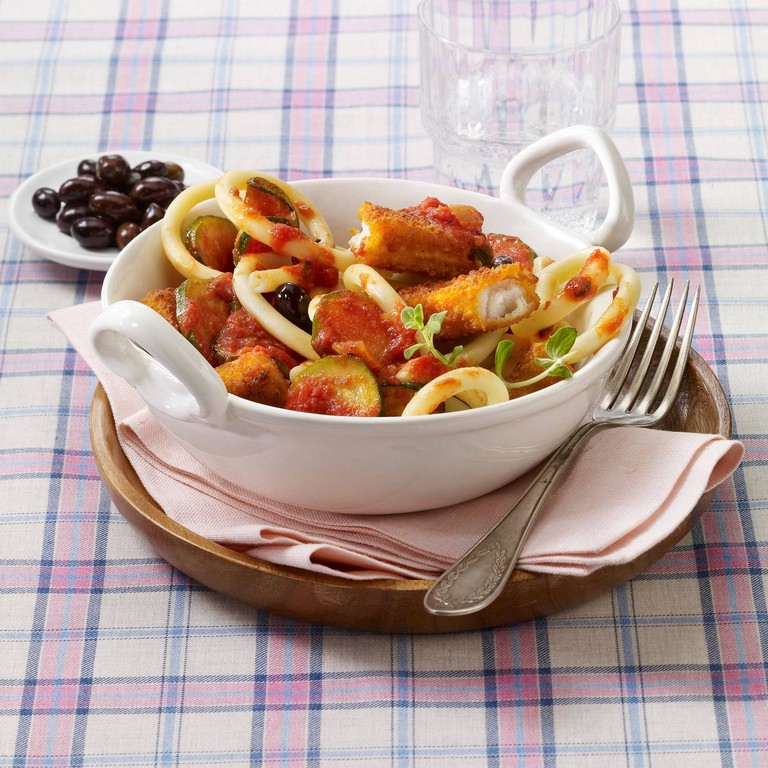 Makkaroni zu Fischstäbchen-Tomatensoße