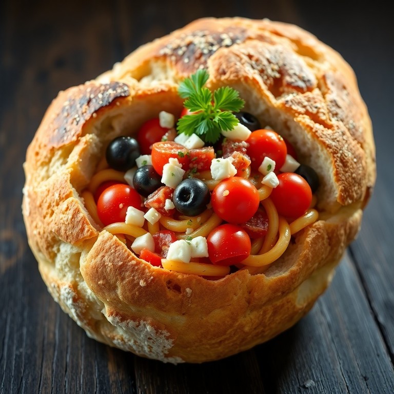 Bol Rústico de Pan de Campo Relleno de Pasta Mediterránea