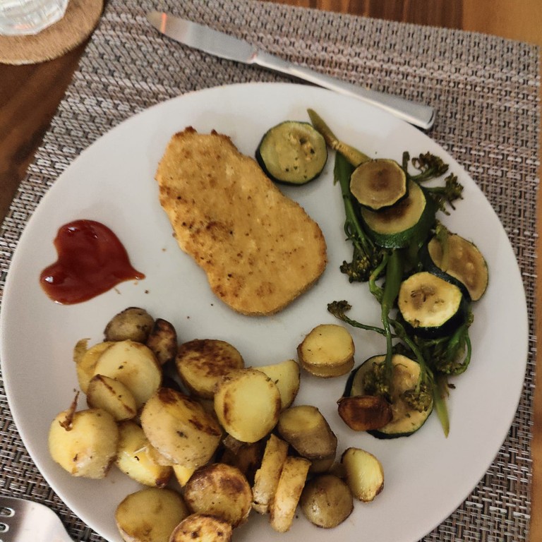 Kross gebratene Vegi-Schnitzel mit Wildbroccoli und kleinen Kartoffeln