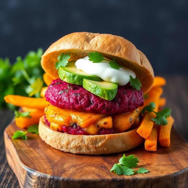 Süßkartoffel-Rote-Bete-Burger mit Avocado und Joghurt-Minz-Soße