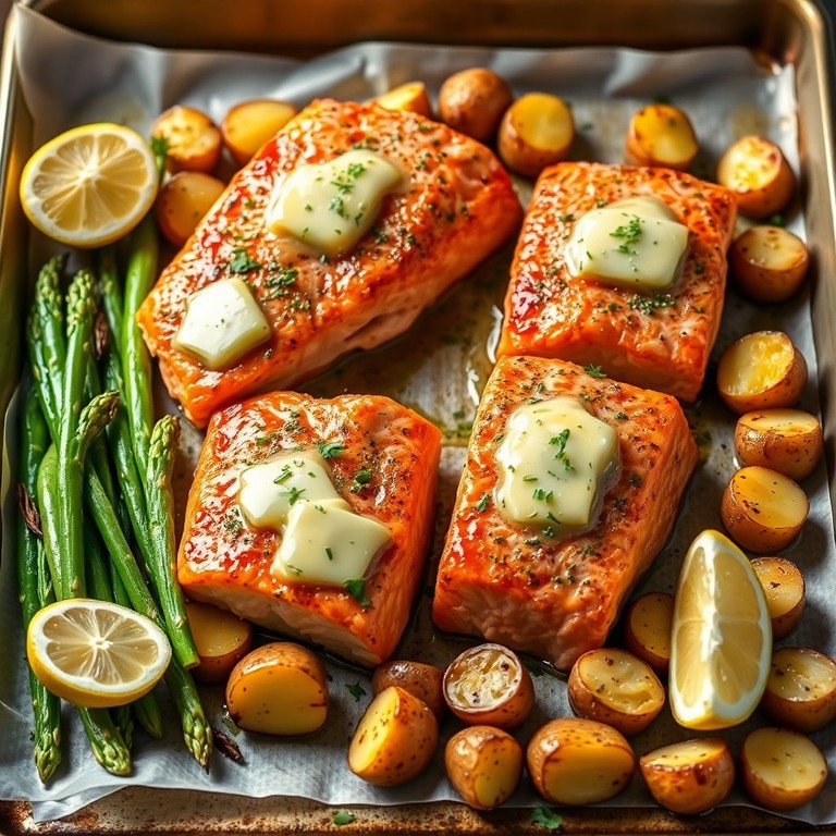 Salmão ao Forno com Manteiga de Alho, Batatas e Aspargos