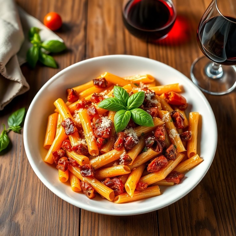 Macarrão Penne ao Estilo Italiano com Bacon e Tomates Secos