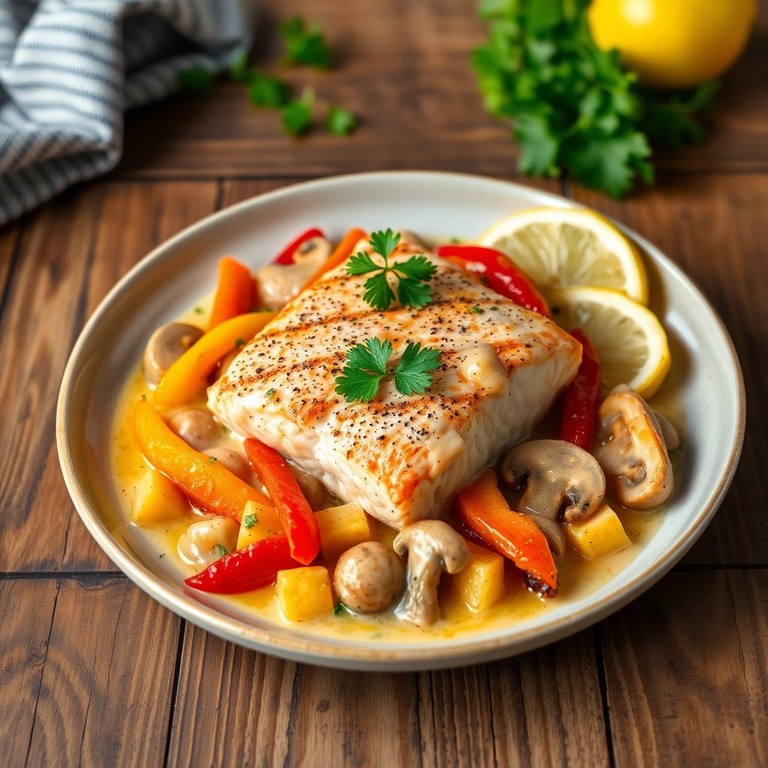 Lachsfilet mit Paprika und Pilzen in Zitronensahnesauce