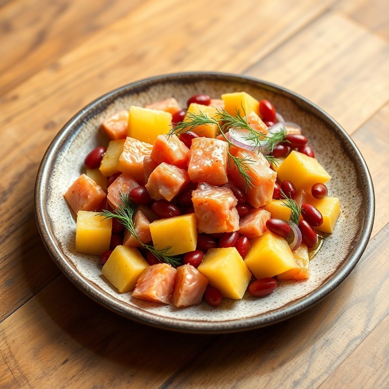 Теплый салат из горбуши, картофеля и красной фасоли