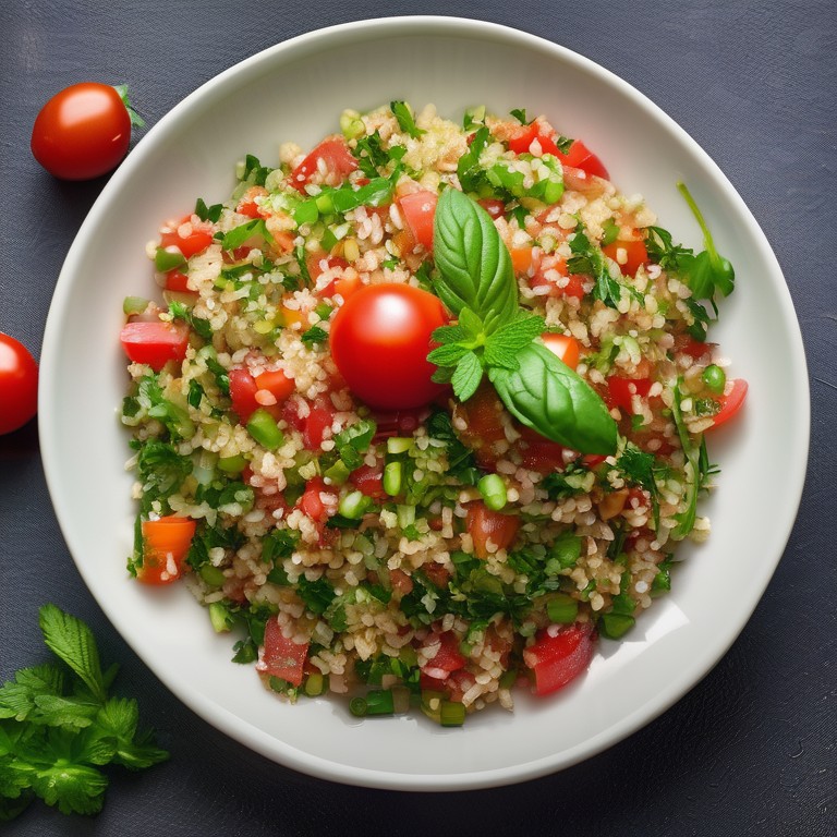 Uma salada refrescante e cheia de sabor, perfeita para qualquer ocasião. Este tabule é uma deliciosa combinação de trigo para kibe, tomates frescos, cebola, pimentão e hortelã, ideal para acompanhar pratos principais ou servir como um aperitivo leve.