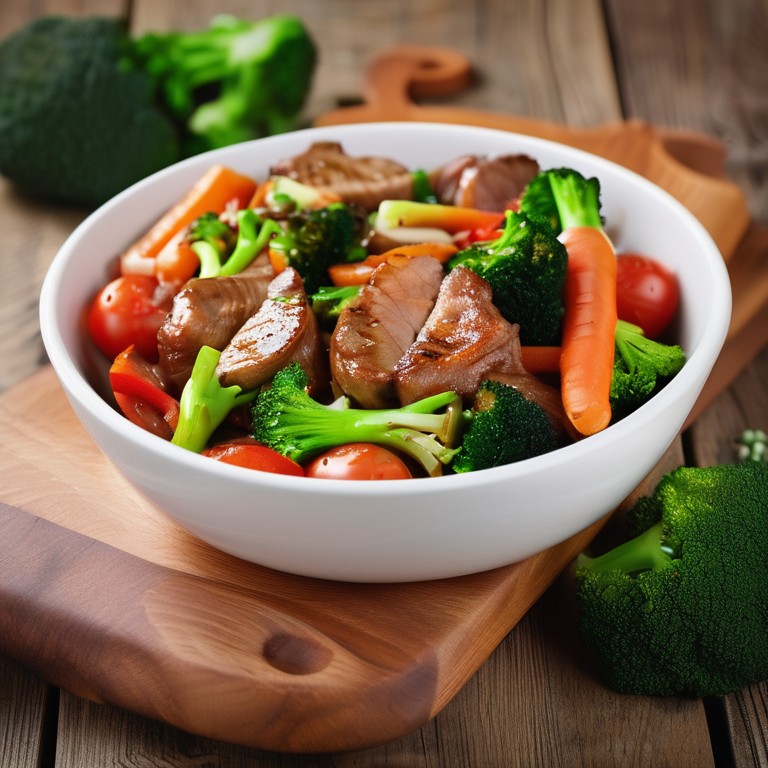 Un delicioso salteado de verduras con chuleta de cerdo, ideal para una comida sabrosa y saludable. Las zanahorias, brócoli, cebolla y tomate se combinan perfectamente con la jugosa chuleta de cerdo en esta receta fácil de preparar.