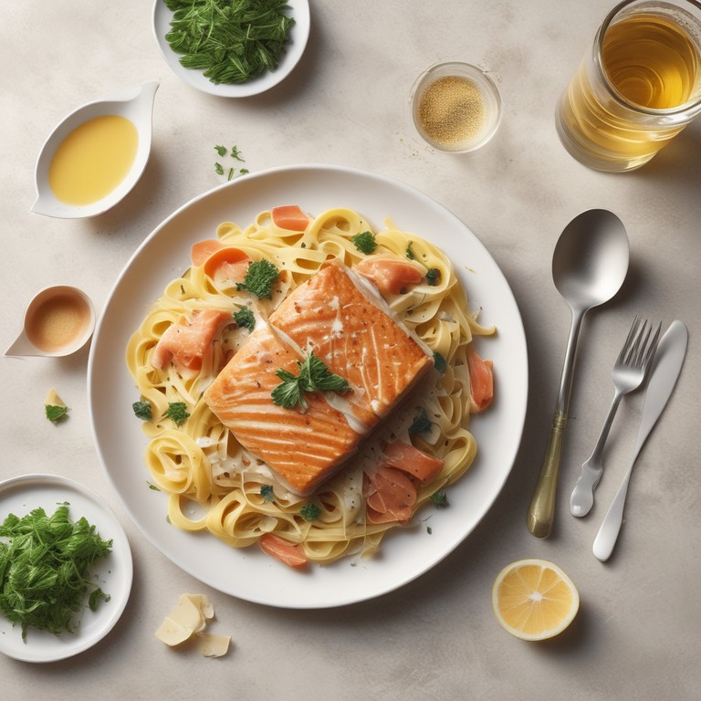 Uma deliciosa combinação de macarrão, salmão fresco e queijo parmesão, perfeita para um jantar sofisticado em casa.