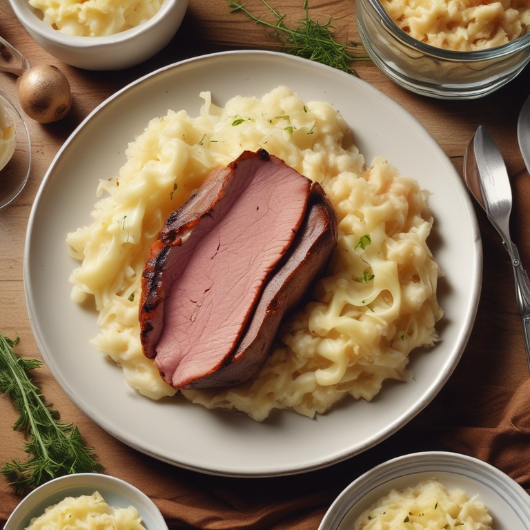 Ein klassisches deutsches Gericht mit herzhaft geräuchertem Kassler, sauerem Sauerkraut und cremigem Kartoffelpüree.