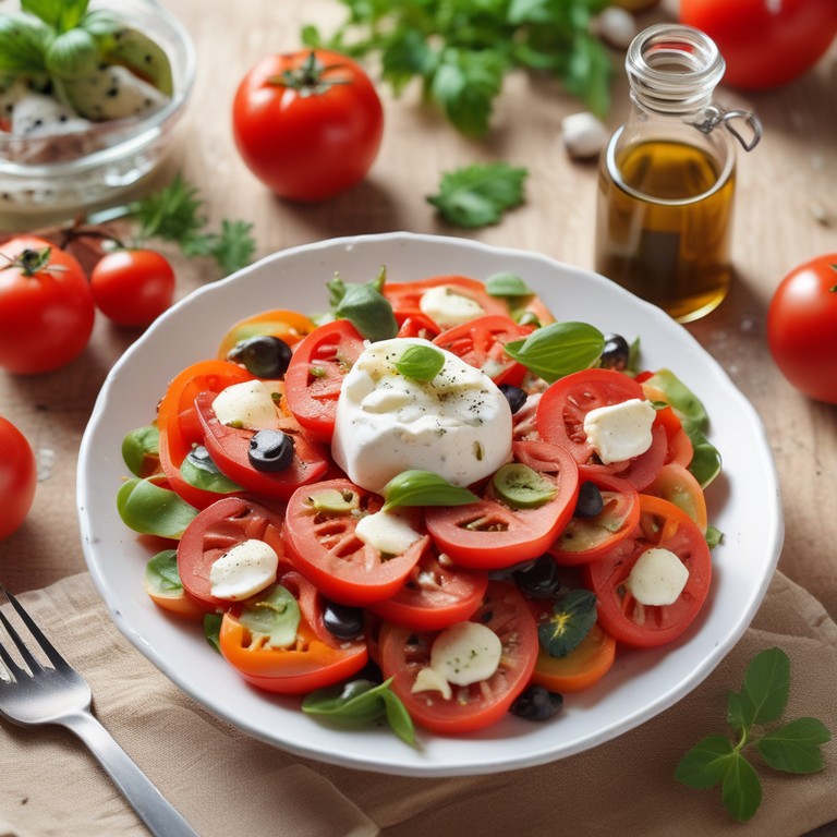 Una ensalada clásica y sencilla que combina la frescura del tomate maduro con la suavidad del queso fresco, aderezada con aceite de oliva y vinagre balsámico. Perfecta como acompañamiento ligero o como plato principal en una comida fresca y saludable.