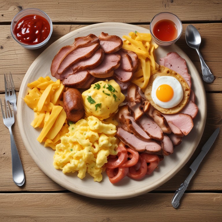 Este desayuno completo es perfecto para comenzar el día con energía. Combina huevos revueltos, jamón, salchichas, papas fritas y pan tostado, todo acompañado de queso derretido y salsas al gusto. Ideal para compartir en familia o disfrutar en un brunch especial.