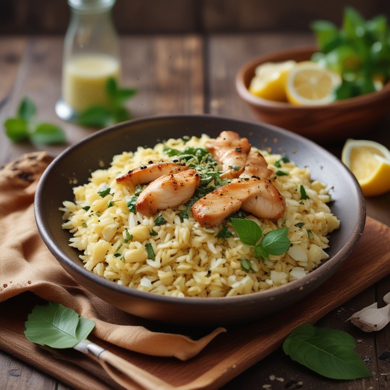 Un plat savoureux de riz au poulet, mélangé avec du pesto frais et rehaussé d'une touche de citron, parfait pour un dîner en famille.
