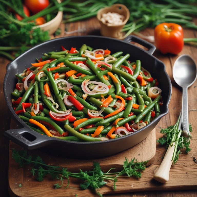 Diese herzhafte Bohnenpfanne ist ein einfaches und schmackhaftes Gericht, das perfekt als Beilage oder Hauptgericht serviert werden kann. Die Kombination aus frischen Bohnen und buntem Gemüse sorgt für einen gesunden und nahrhaften Genuss.