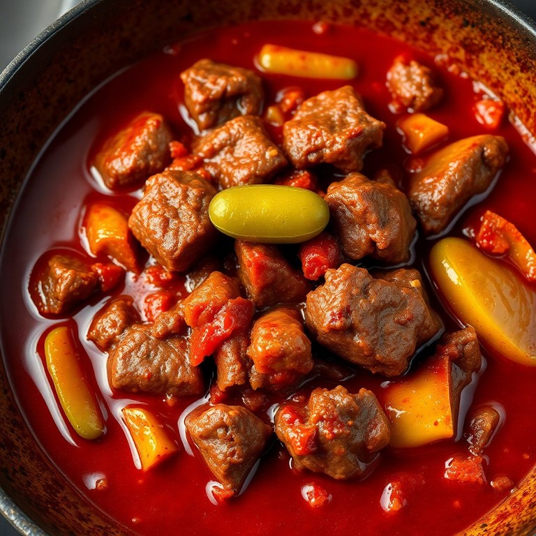 Это блюдо представляет собой нежные кусочки говядины, тушенные в насыщенном соусе с томатной пастой и уксусом, что придает ему легкую кислинку. Добавление капусты и маринованных огурцов делает его идеальным дополнением к любому гарниру.
