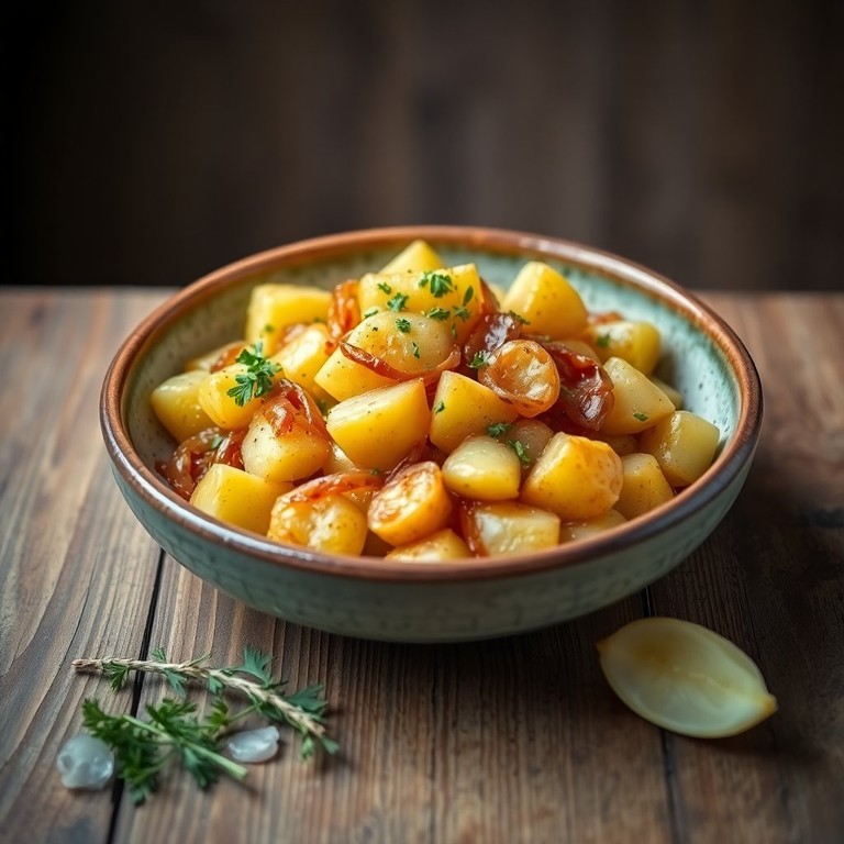 Un plato reconfortante de papas salteadas con cebolla dulce y ajo, ideal como acompañamiento o plato principal.