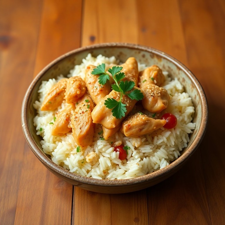 Um prato reconfortante de arroz parboilizado com frango suculento e um toque fresco de salsa, perfeito para uma refeição em família.