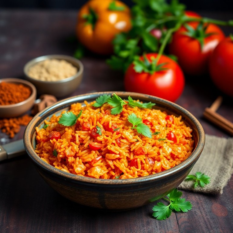 Un plat savoureux de riz aux tomates et aux épices exotiques, parfait pour accompagner vos repas ou comme plat principal.