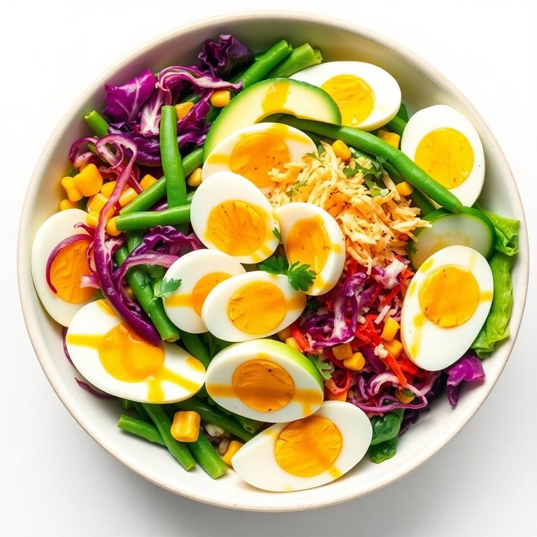 Nutritiva y sustanciosa, esta ensalada mezcla chauchas tiernas, huevo duro y un aderezo ligero, acompañada de una variedad de verduras frescas que aportan color y textura.