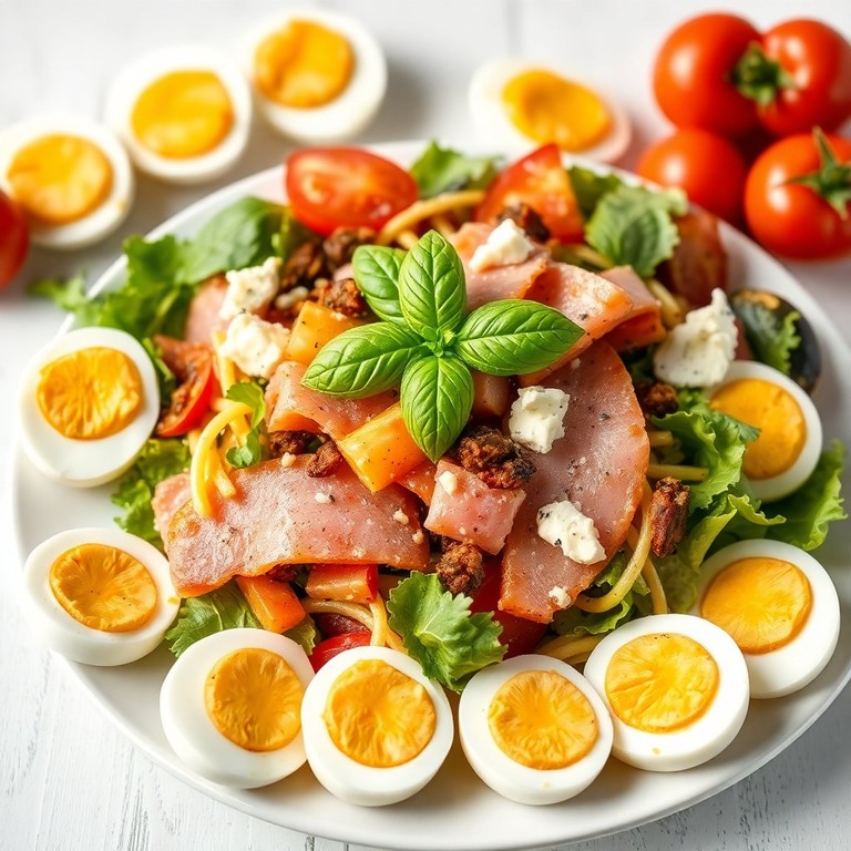 Ein erfrischender Salat mit saftigem Schinken, würzigem Käse und knackigem Gemüse, perfekt für warme Tage oder als leichtes Mittagessen.