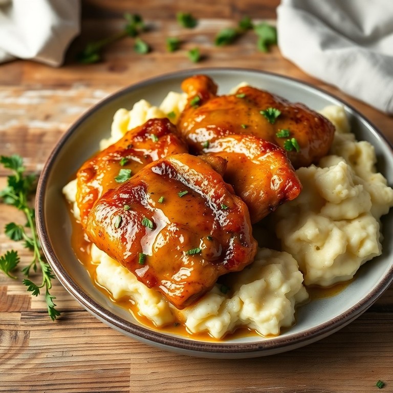 Saftige Putenschenkel, mariniert in einer süß-sauren Honig-Senf-Mischung, begleitet von Kartoffelpüree.