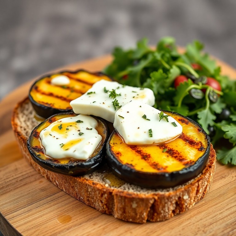 Découvrez un mariage parfait de saveurs sucrées et salées avec ce plat d'aubergines grillées, nappées de miel et garnies de fromage de chèvre frais. Servi sur du pain complet croustillant, accompagné d'une salade verte, c'est un délice à savourer en toute saison.