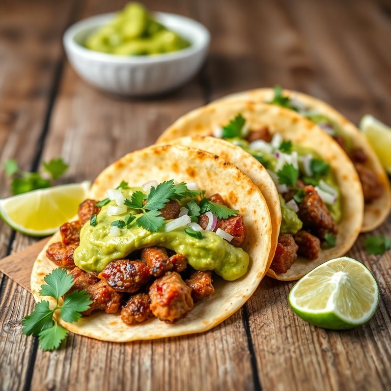 Deliciosos tacos de carne asada acompañados de un guacamole cremoso y fresco para un festín de sabores.