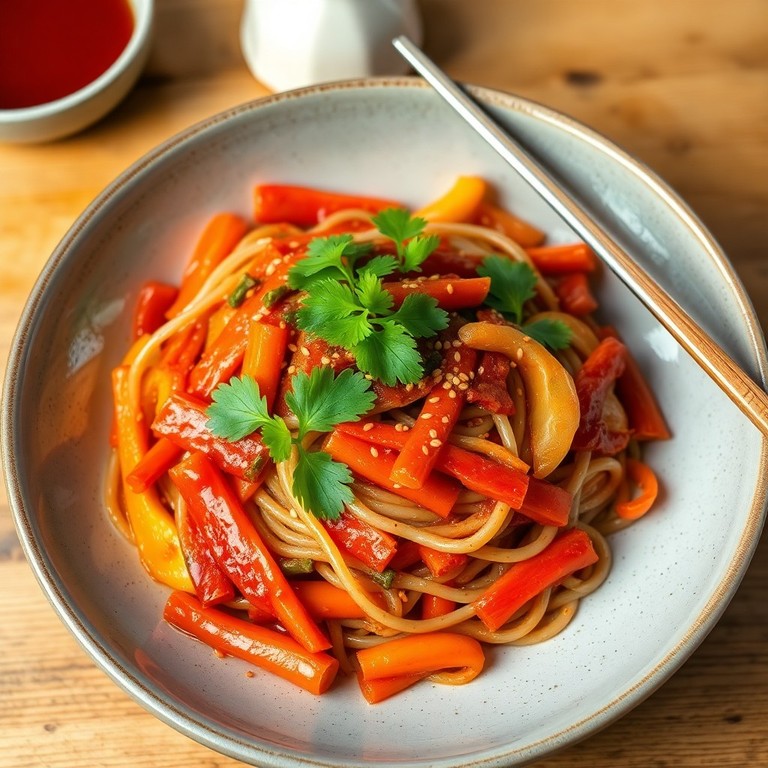 Savory and spicy, this dish combines chewy udon noodles with stir-fried kimchi and a medley of vegetables in a gochujang-based sauce. Ready in under 30 minutes.