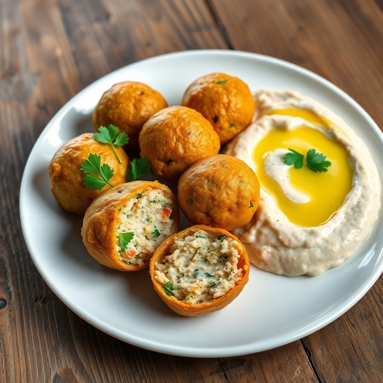 Kleine, goldbraun gebackene Gemüse-Bällchen, gefüllt mit zartem Hähnchenfleisch und gedünstetem Gemüse, serviert mit einem cremigen, zitronigen Couscous-Dip. Dieses Gericht kombiniert eine proteinreiche Füllung mit einer frischen, leichten Beilage und eignet sich perfekt als gesunder Snack oder leichtes Hauptgericht.