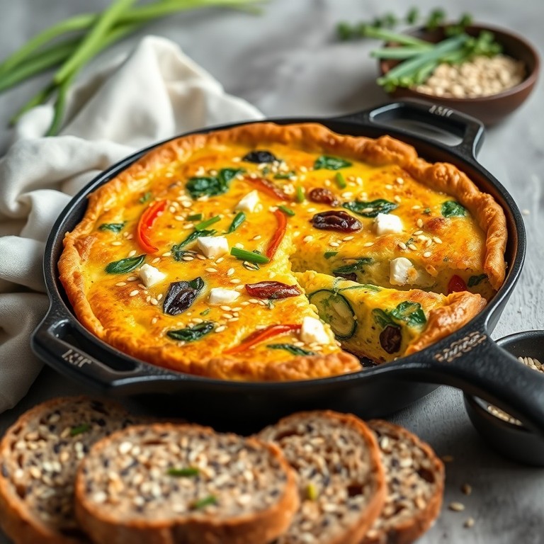 Une frittata moelleuse et colorée, garnie de légumes sautés, de feta et de graines de sésame, idéale pour un repas sain et savoureux. Parfaite à partager, elle s’accompagne de pain aux graines pour un brunch ou un déjeuner équilibré.