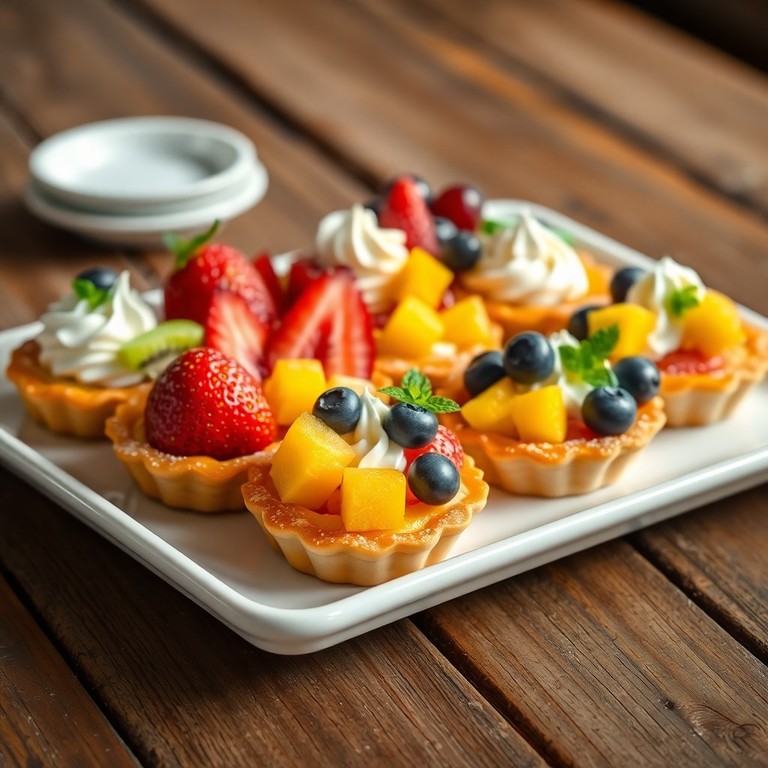 Deliciosas mini tartas individuales con una base crujiente de masa quebrada, rellenas de una suave crema pastelera y nata montada, decoradas con frutas frescas variadas en colores vivos. Perfectas para niños por su presentación divertida y vistosa, ideales para fiestas o meriendas especiales.