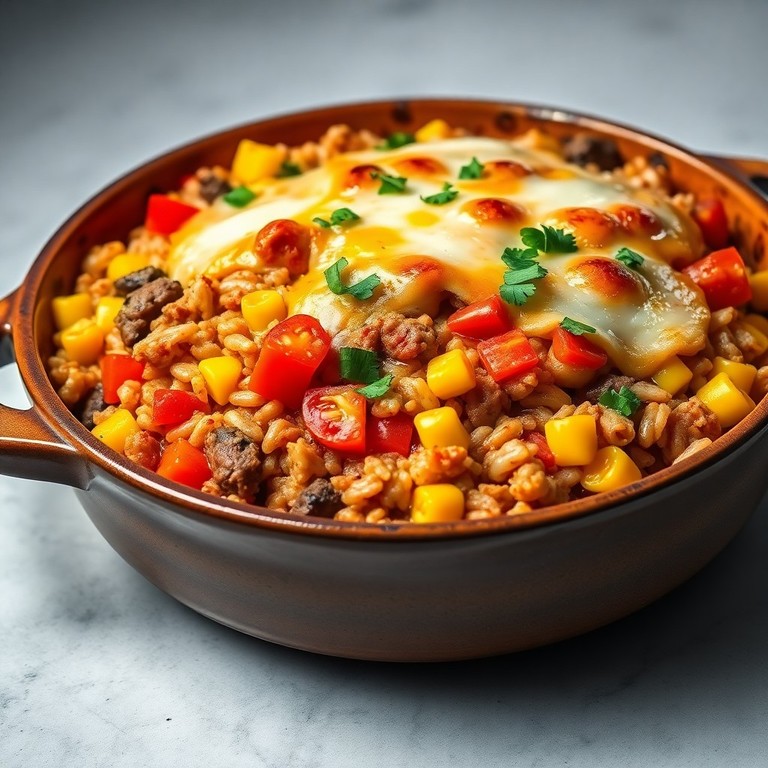 Arroz gratinado com carne moída, pimentões, milho e tomate, perfeito para uma refeição rápida, saborosa e reconfortante. Combina o sabor suculento da carne com a textura macia do arroz e a doçura dos legumes, finalizado com queijo gratinado que dá um toque especial.