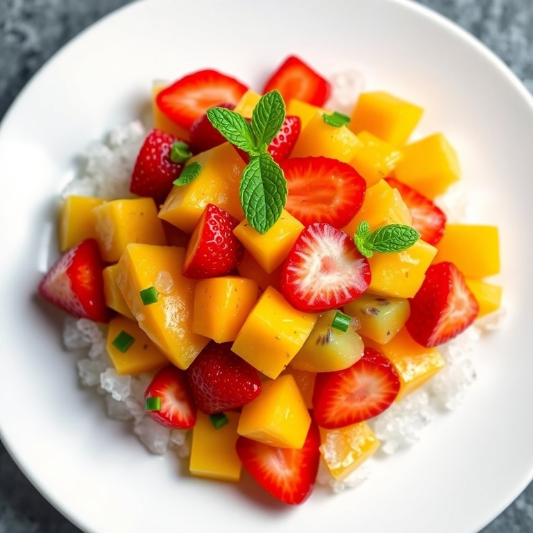 Una entrada refrescante y elegante que combina frutas tropicales frescas con una vinagreta cítrica de maracuyá, perfecta para despertar el paladar en un menú gourmet de tres platos para tres personas.