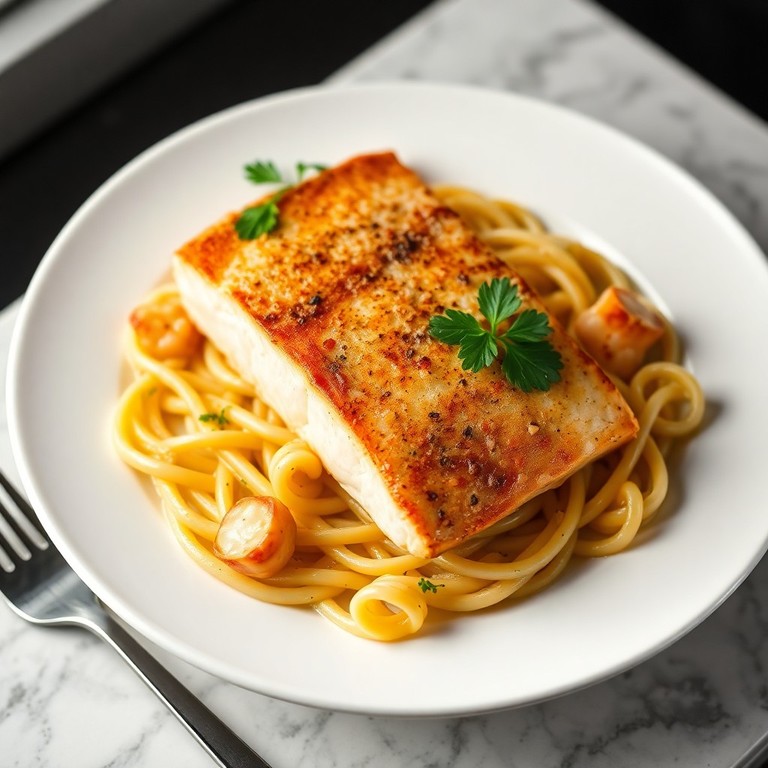 Een elegante hoofdschotel waarbij malse griet of tarbot wordt geserveerd met een romige kreeftensaus en gedroogde saffraanpasta. In plaats van huisgemaakte pasta wordt hier gedroogde pasta met saffraan gebruikt, wat het recept vereenvoudigt en tijd bespaart zonder in te leveren op smaak.
