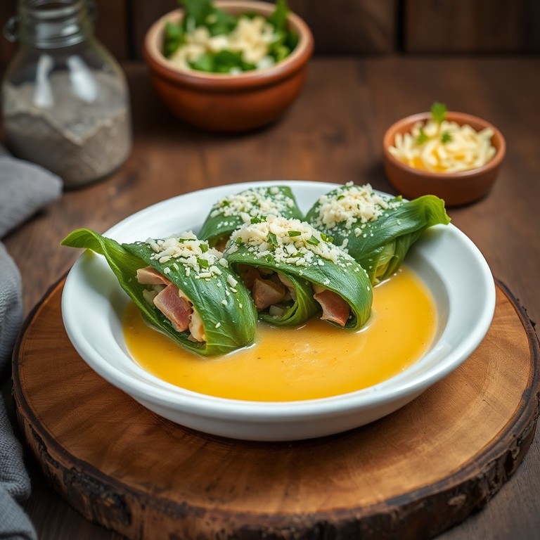 Capuns sind eine klassische Spezialität aus Graubünden in der Schweiz. Diese kleinen Teigtaschen werden mit einer würzigen Mischung aus frischen Kräutern, Schinken und Spätzleteig gefüllt, in Mangoldblätter gewickelt und in einer aromatischen Brühe gegart. Sie sind herzhaft, aromatisch und ein echtes Wohlfühlessen – perfekt als Hauptgericht oder als Teil eines festlichen Menüs.