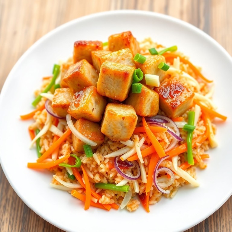 Cubos de frango marinados em especiarias asiáticas, salteados até dourar, servidos com um arroz colorido e aromático que leva repolho, cenoura, alho-poró e cebola roxa. Uma combinação rápida e saborosa, perfeita para uma janta nutritiva e cheia de sabor.