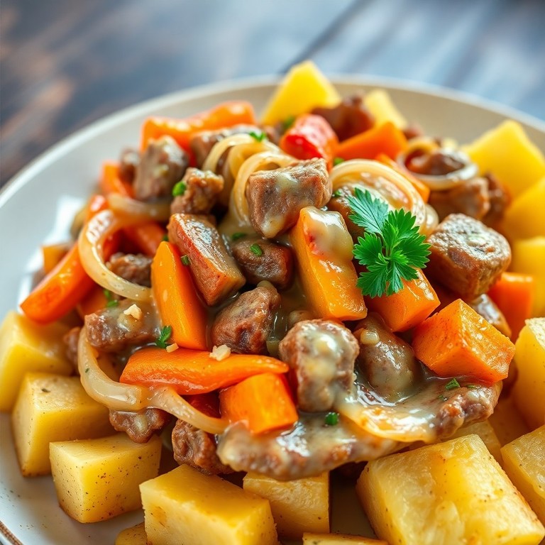 Een snel en voedzaam wokgerecht waarbij gesneden rundsvlees wordt gebakken met wortels, ajuin en look, afgewerkt met een lichte roomsaus. Dit gerecht is ideaal voor een snelle, smaakvolle maaltijd met minimale afwas, perfect geserveerd met gekookte aardappelen.